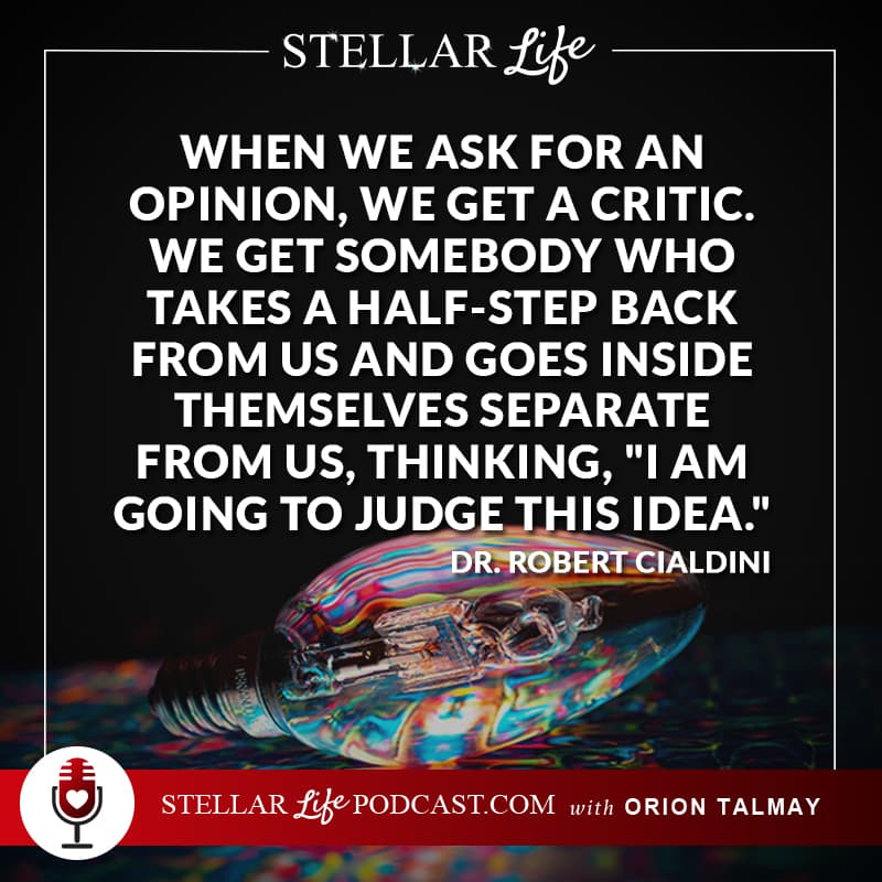 What we typically do is we'll show those folks an outline or a draft of our idea and ask for their feedback on it. But here's the mistake we make, we ask for their opinion. And when we ask for an opinion, we get a critic. We get somebody who takes a half step back from us and goes inside themselves separate from us, goes inside themselves and aligns themselves with everybody else against us now that that's how they're thinking, “Okay, I'm going to judge this idea, and I'll represent myself and everybody else versus this idea.” If we change one word instead of asking for their opinion, we asked for their advice. This time we get a partner instead of a critic.